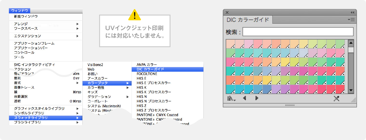 Adobe Illustrator®の【ウインドウ】→【スウォッチライブラリ】→【カラーブック】→【DICカラーガイド】を選択していただくと、